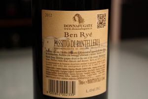 In retro etichetta troviamo alcune infos altrettanto utili, per esempio l’anno della vendemmia ,con quali uve è prodotto e con quale metodo (zibibbo e appassimento), un consiglio di abbinamento e un consiglio sulla temperatura di servizio che a sorpresa si aggira intorno ai 14° , cioè non freddo perché gli zuccheri verranno esaltati dal calore. Troviamo scritto anche : vino da meditazione. Qui dovrei entrare in un argomento lungo e complesso ma mi limito a dire che i vini da meditazione sono oramai assurti a categoria a sé, pur nascendo da un mero suggerimento di consumazione : “ Se lo bevete mentre siete immersi nei vostri pensieri lo apprezzerete di più”. Io ne consiglio il consumo con i formaggi erborinati e un tocco di miele di castagno, sappiate che rischiate l’effetto droga, ma ne vale la pena. Altra importante dicitura è : “contiene solfiti” esageratamente tradotta in 20 lingue, credo comprenda l’aramaico. Dicitura importante quanto fuorviante perché può nascondere false informazioni legate alla salute e per la quale rimando all’articolo dedicato ai solfiti e il mal di testa. Infine un occhio alla cantina di produzione e imbottigliamento che in questo caso coincidono, ma non sempre. E come chiosa definitiva voglio farvi notare la gradazione alcolica che è una informazione obbligatoria e in questo caso anche illuminante, perché 14,5 gradi alcolici non sono bazzecole e la dolcezza neanche ve ne farà rendere conto, per cui se decidete di degustarlo “mentre siete immersi nei vostri pensieri”, raccomando le piccole dosi per non portare i vostri pensieri in campi minati.